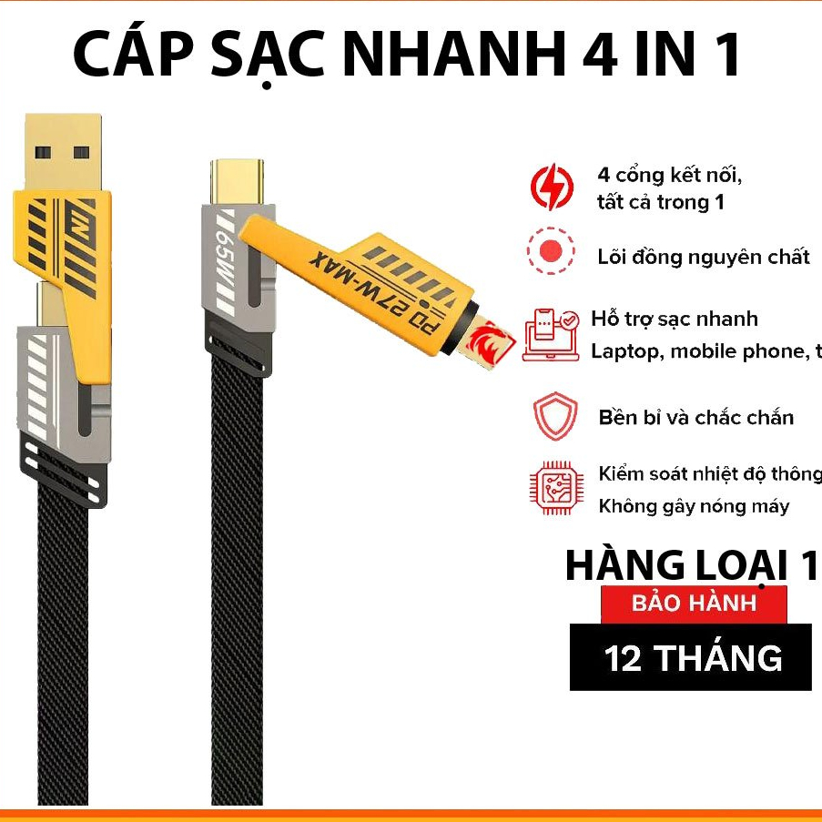 | Màu sắc | [Cáp Lò xo 4in1], Cáp sạc 65W 4 in 1, Cáp Silicon Tím 20W, Cáp Silicon Vàng 27W |