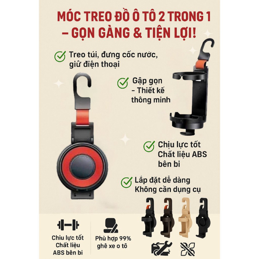 Chắc chắn rằng bất kỳ tài xế nào cũng đều muốn có một chiếc ô tô ngăn nắp, sạch sẽ và đầy tiện nghi. Móc treo đồ ô tô 2 trong 1 không chỉ là một phụ kiện thời thượng, mà còn là một giải pháp tối ưu để duy trì sự gọn gàng trong không gian xe hơi của bạn. Với thiết kế thông minh, sản phẩm này được tích hợp với hai tính năng tuyệt vời: vừa treo túi, vừa giữ điện thoại/ cốc nước một cách tiện lợi.